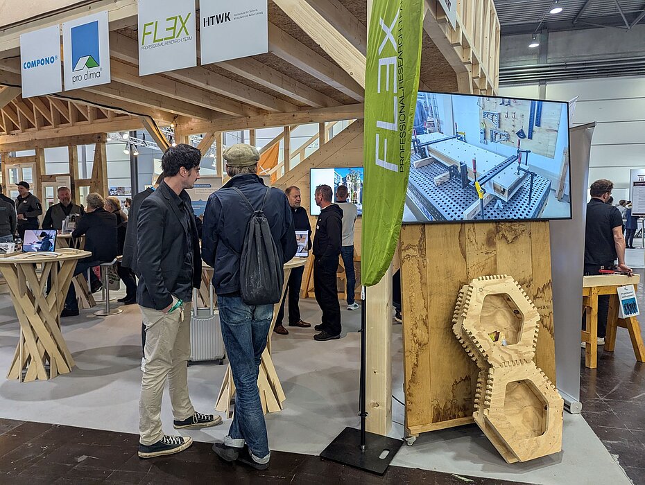 Ebenso zeigt die interdisziplinäre Forschungsgruppe FLEX Einblicke in aktuelle Forschungsprojekte zur Anwendung von Augmented Reality in der Montagehalle, zum Feuchte-Monitoring im Holzbau sowie zu modularen, hölzernen E-Tankstellen.