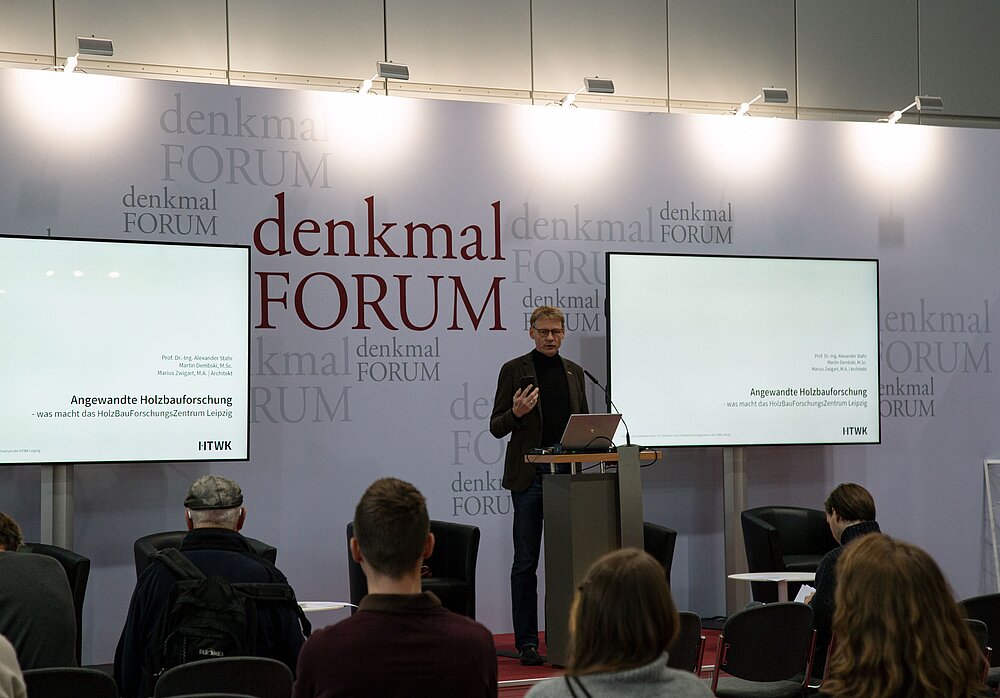Die HTWK-Forschungsgruppe FLEX um Prof. Dr. Alexander Stahr zeigt am Gemeinschaftsstand mit dem Bauunternehmen Bennert einen zweigeschossigen Pavillon, dessen Dach auf der Konstruktionsidee von Friedrich Zollinger basiert. Die Forschenden interpretierten das Dachkonzept in mehrjähriger Forschungsarbeit neu und gestalteten daraus mittels moderner Technologie in Daten- und Holzverarbeitung eine Spitztonne. Zu sehen ist das Exponat in Halle 2, Stand K 20. Den neuesten Meilenstein der Forschungsgruppe – das im August 2024 eröffnete HolzBauForschungsZentrum Leipzig – stellt Stahr am 7. November ab 10:30 Uhr im Vortrag beim denkmal-Forum vor.