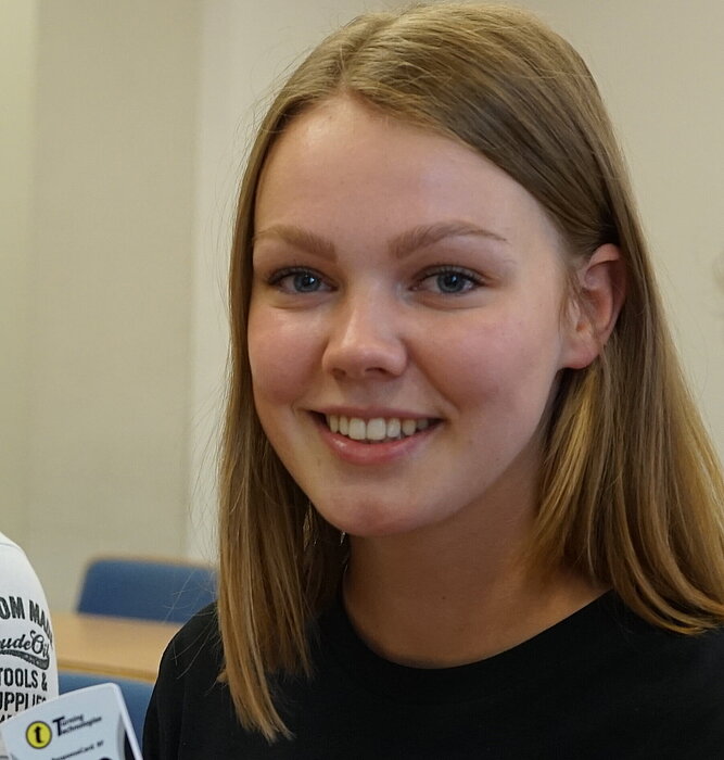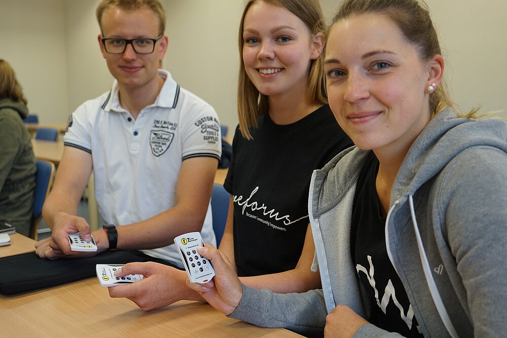 Nils Wieben zeigt auf seinen Clicker: „Das ist eine sehr gute Idee für die Lehre – vor allem wegen der interessanten Fragestellungen.“ Neben ihm sitzt Leonie Schumann und ergänzt: „Die Visualisierung ist hilfreich, man vergleicht sich ja doch! Gut ist vor allem, dass hinterher eine fundierte Auswertung folgt.“ Und Maxi Otto sagt: „Es geht zwar recht viel Zeit für die Übung drauf – aber die ist gut investiert.“