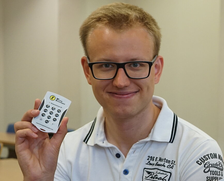 Darauf angesprochen, schmunzelt der 34-Jährige, greift in den Stoffbeutel und fischt einen Clicker heraus. Halb so groß und halb so flach wie ein Handy, zwölf kleine Tasten. „Das sind 40 Stück, eine Leihgabe von der Uni, jedes Teil rund 40 Euro wert.“ Aha! Ganz schön wertvoll, das grüne Beutelchen. Bloß nicht liegenlassen!