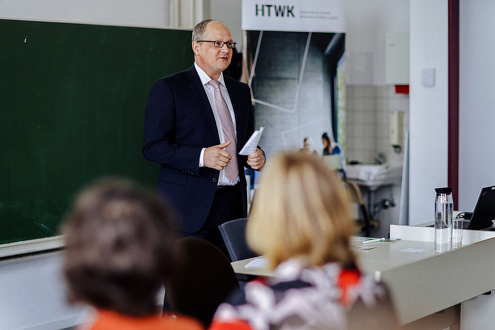Mit dem Aufruf "Frauen, seid mutig, vernetzt Euch und sucht Verbündete" sprach sich auch Professorin Graßmann (MDC, Berlin) in ihrer Keynote für gegenseitiges Empowerment aus. Unter dem Thema „Empowering Excellence: Frauen im Wissenschaftsnetzwerk“ lud sie die Teilnehmerinnen dazu ein, proaktiv die nächsten Karriereziele anzugehen und sich engagiert den Herausforderungen einer wissenschaftlichen Laufbahn zu stellen. Wie sich der Alltag im Wissenschaftskontext an der HTWK Leipzig real gestaltet und welche unterschiedlichen Perspektiven und Erfahrungen es zum Thema wissenschaftliche Karrierepläne gibt, konnten die Gäste im Anschluss bei der Podiumsdiskussion von (Nachwuchs-) Wissenschaftlerinnen der HTWK Leipzig erfahren.
