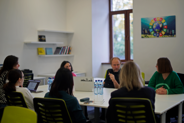On November 4, we met with Elene Jgarkava (Head of the Business School), Ketevan Karbaia (Director of the International Relations Department), and Ani Tavartkiladze (Deputy Director of the International Relations Department) at CU. Our hosts organized a campus tour, during which we met CU students participating in the summer school in September 2025. The meeting focused on discussing future cooperation between the two universities within EU and DAAD projects.