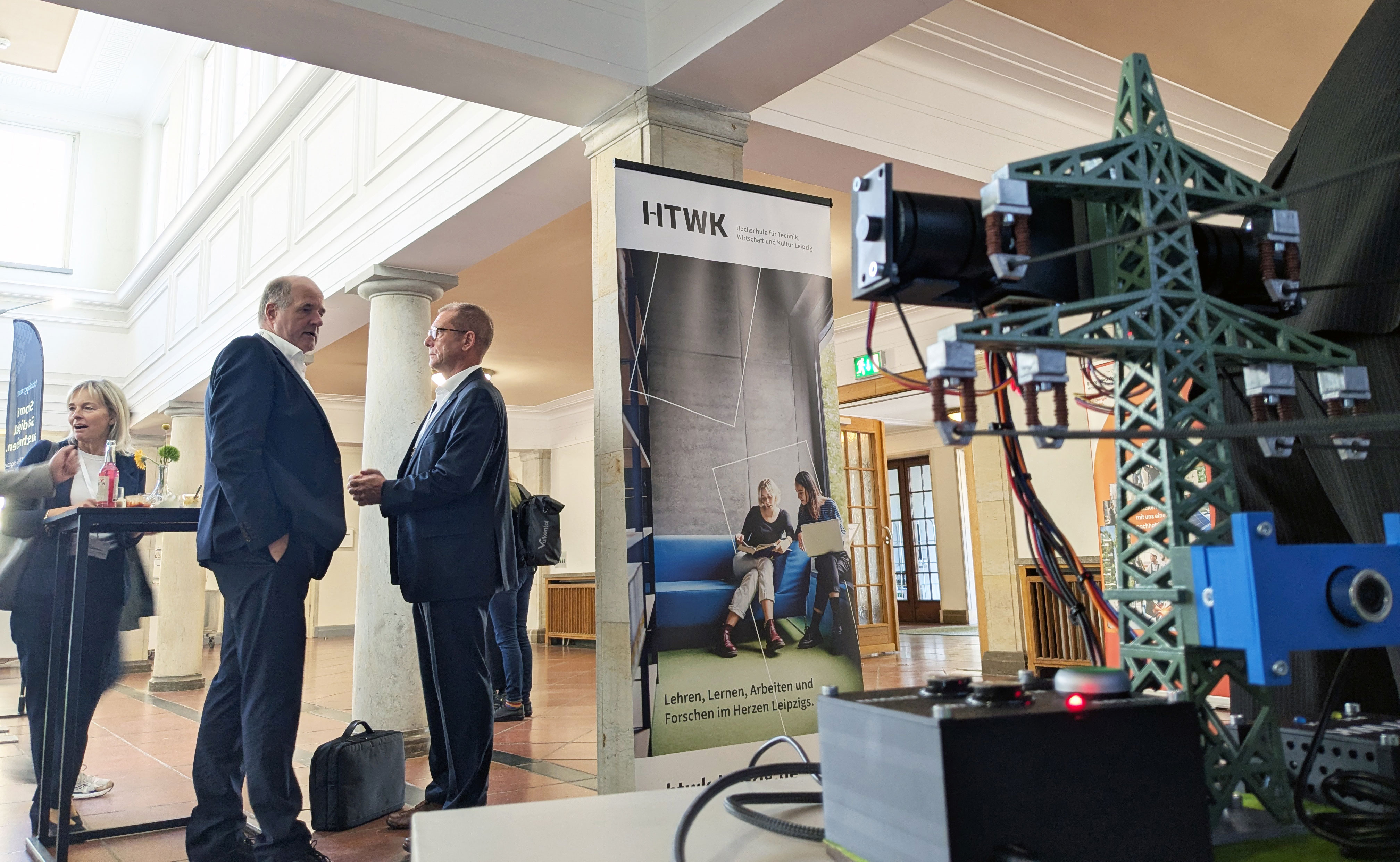 Das Team von Faouzi Derbel, Professor für Smart Diagnostik und Online Monitoring und Prorektor für Forschung und Nachhaltigkeit der HTWK Leipzig, präsentiert eine Messeinrichtung, die im Rahmen des Forschungsprojekts Zapdos entwickelt wurde. Das patentierte Diagnosesystem kann an Hand des Leiterseildurchhangs einer Freileitung messen, wie viel Energie durch die Stromleitungen fließt und wie hoch die Auslastung tatsächlich sein kann, um dem wachsenden Energiebedarf gerecht zu werden. So kann das Netz optimaler genutzt werden, ohne es ausbauen zu müssen.