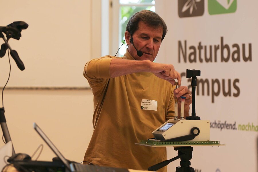 Dass Fortschritt und Tradition kein Widerspruch ist, zeigten Beiträge aus Forschung und Industrie. Dr. Franziska Knoll (GOLEHM-Initiative) und Maximilian Breidenbach (Claytec) stellten den modernen Lehmbau als vielversprechende Alternative zu konventionellen Bauweisen vor.