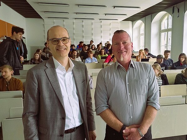 Prof. Holger Müller (Professur für ABWL, insbesondere Marketing und Messewesen) begrüßt Markus Geisenberger (Geschäftsführer Leipziger Messe) zum Messe-Gastvortrag an der HTWK