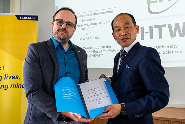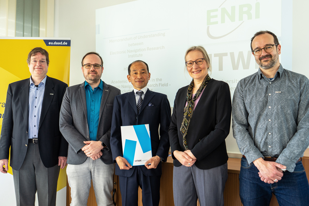 On April 22, the Faculty of Digital Transformation welcomed Takafumi Nakada, Senior Director for International Affairs at the Electronic Navigation Research Institute (ENRI) in Tokyo at HTWK Leipzig. The aim of the visit was to deepen existing contacts and to discuss further cooperation opportunities. Mr. Nakada also used his visit to get to know HTWK Leipzig better. Dean Professor Oliver Crönertz handed over a cooperation agreement signed by the university’s Rector for academic collaboration in the field of electronic navigation and air traffic management.