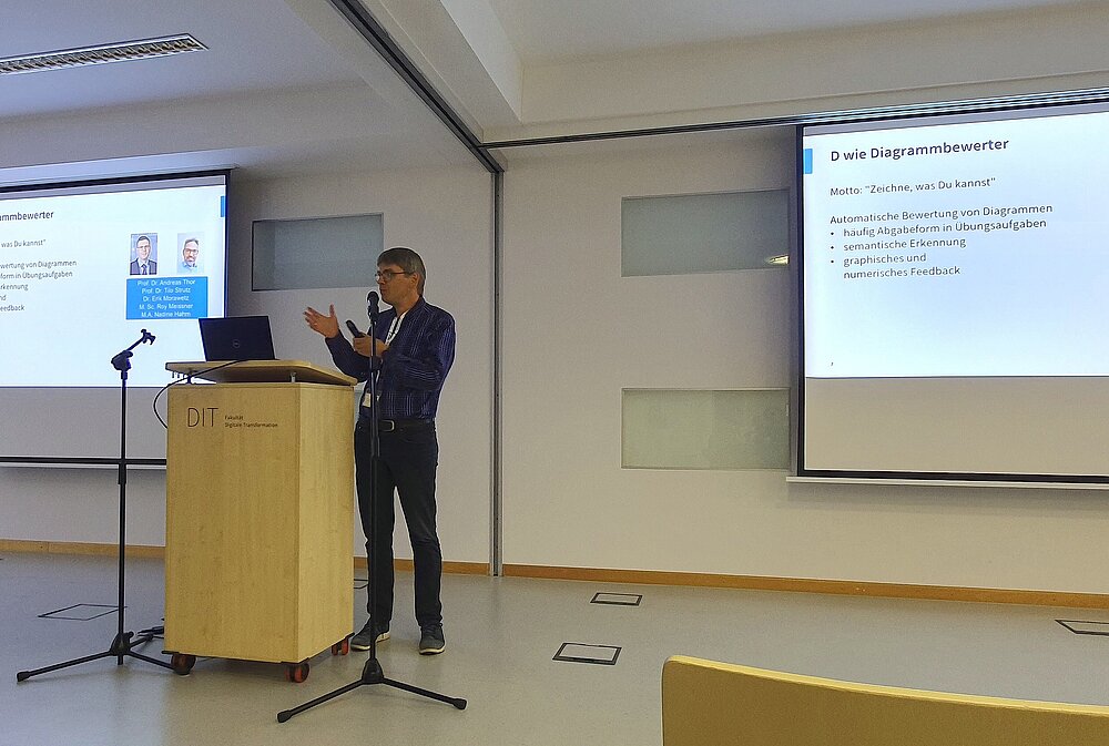 Das Abschluss-Event begann mit der Begrüßung durch den Prorektor für Bildung, Axel Klarmann. Die beiden Projektleiter Andreas Thor und Konrad Schöbel haben dann einen Blick zurückgeworfen auf die verschiedenen Facetten von vier Jahre Lehr-Lern-Projekt. Anschließend stellten sich die Teilprojekte in kurzen Pitches vor, bevor ausreichend Zeit an Ständen bestand, sich bei den Demopräsentationen selbst ein Bild zu den aktuellen Entwicklungen bei feedback-basierten E-Assessment in MINT-Fächern zu machen und das ein- oder andere Tool auch selbst auszuprobieren.