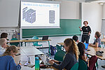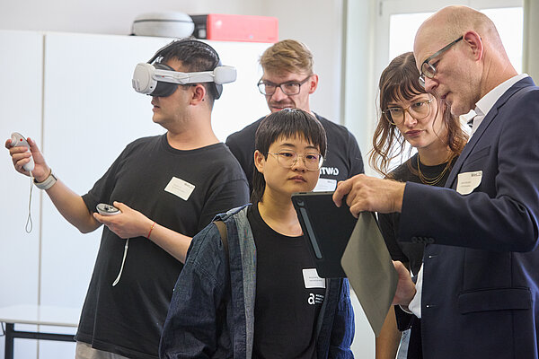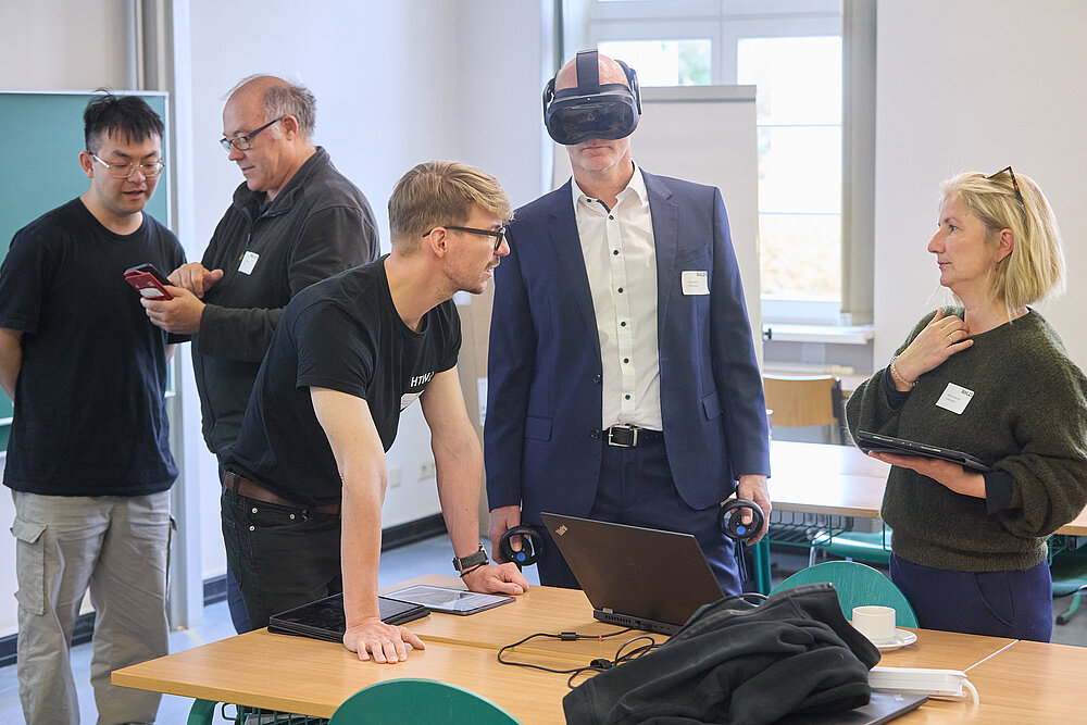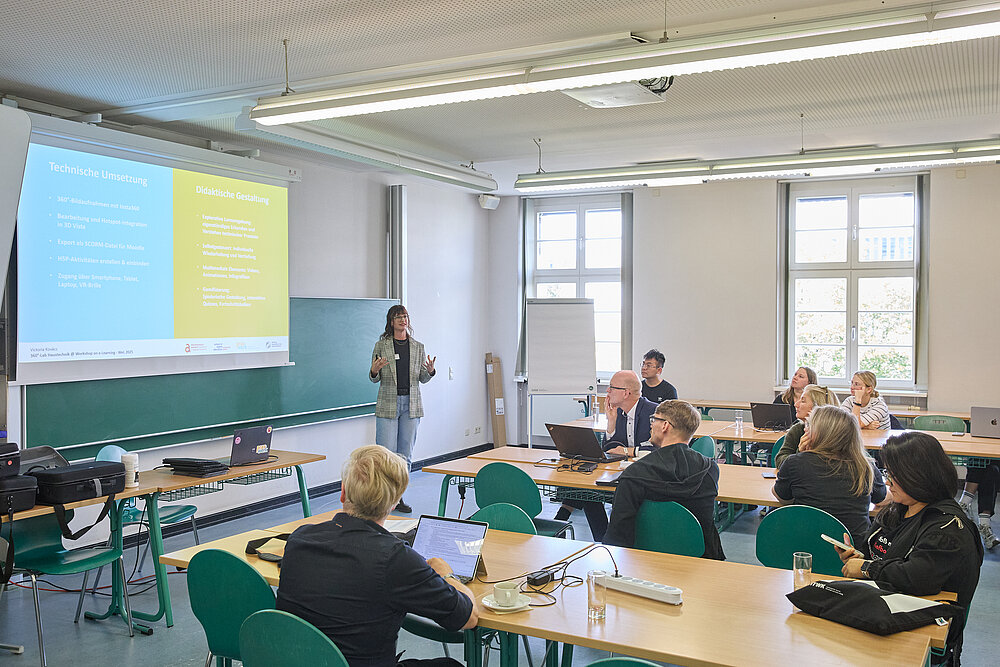 In einer dritten Session konnte man sich in interaktiven Workshops weiterbilden und austauschen. Es gab die Möglichkeit, INGenious Quizzing,ein Projekt zur KI-gestützten Erstellung von Übungsaufgaben in der Hochschullehre oder die App StudiSQ, die Lernen mit Gamefication verbindet, auszuprobieren. In einem dritten Workshop wurde ein digitales 360°-Labor der Haustechnik vorgestellt, das zentrale gebäudetechnische Systeme wie Wärmepumpen, Lüftungs- und Heizungsanlagen virtuell erlebbar macht. Die Teilnehmenden erhielten nach einer kurzen Einführung die Möglichkeit, das Labor eigenständig an digitalen Endgeräten zu erkunden. Anschließend wurde gemeinsam diskutiert, ob und wie solche digitalen Lernräume hochschulweit eingesetzt werden können.