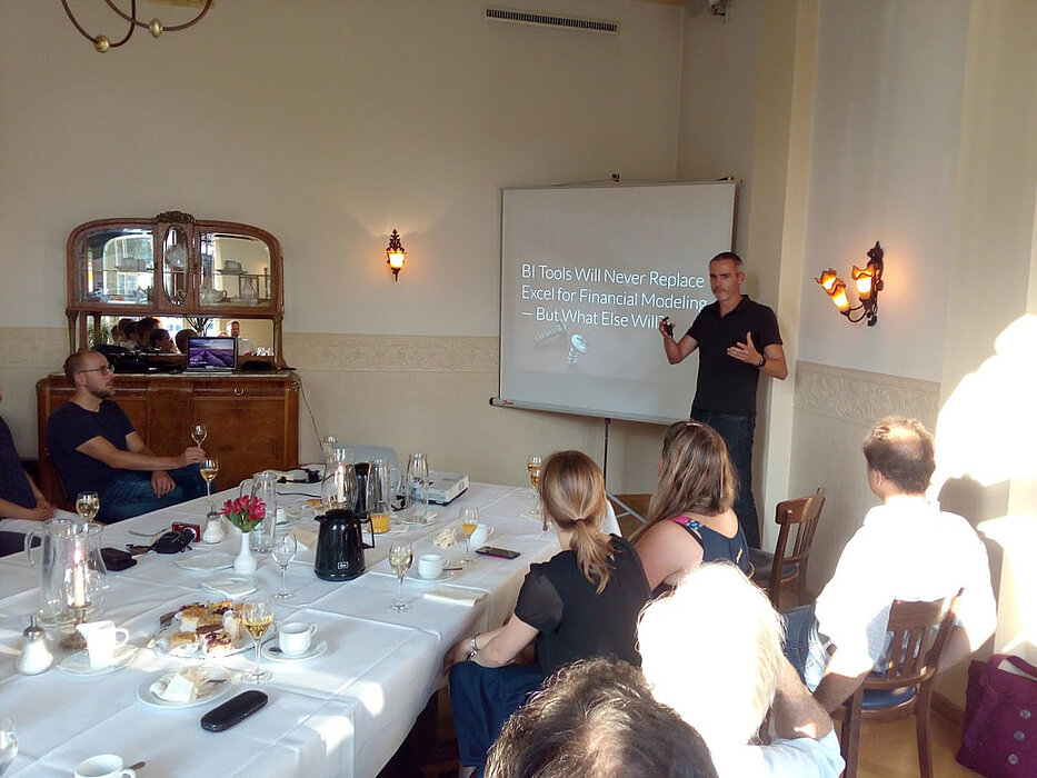 Die hochsommerliche Temperatur ließ uns ganz schön schwitzen. Zudem war der Zeitplan schon zur Vortragshalbzeit erheblich überschritten. Aber alle waren trotzdem neugierig auf die noch kommenden Themen. Torsten Röhner stellte zu Beginn seiner Präsentation die provokante Frage: „BI-Tools werden Excel im Financial Modeling niemals ersetzen können. Aber was dann?“ Er hatte natürlich eine Antwort und stellte uns das Modellierungstool Analytica und seine Einsatzpotenziale für viele betriebswirtschaftliche Themenstellungen vor. Seine Ausführungen haben zum Ausprobieren angeregt!