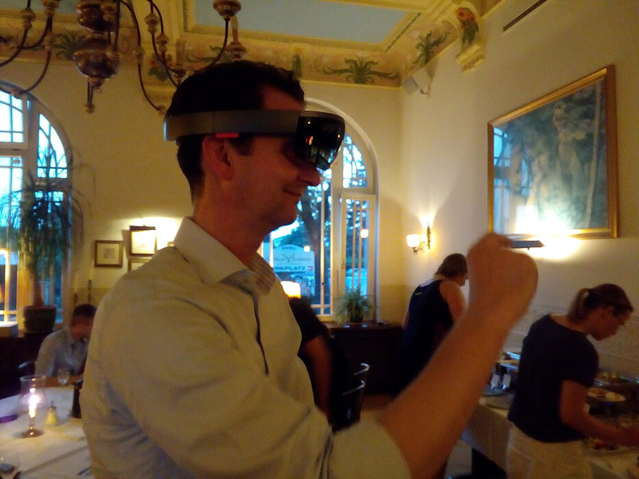 Der Zeitplan war nun über eine Stunde überschritten. Wir waren fachlich sehr bereichert. Das Buffet war aufgebaut. Wir widmeten uns daher nun in entspannter Atmosphäre den angebotenen Köstlichkeiten und beobachteten dabei die HoloLens-Tester, die mit den Armen fuchtelnd im Raum umherwanderten.