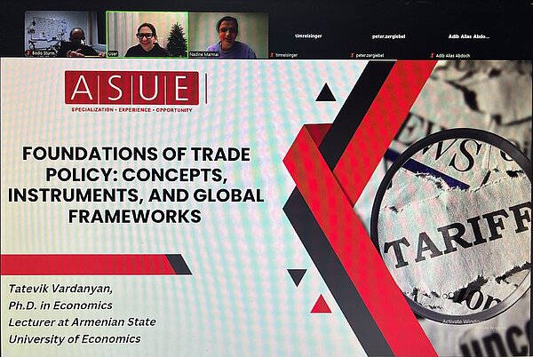 On Wednesday, 14 November 2026, Dr. Tatevik Vardanyan, from the Armenian State University of Economics (ASUE), gave an online guest lecture in which she introduced the key concepts, instruments, and global frameworks of trade policy. The lecture included a practical excursus focusing on the context of the EU–Armenia relationship. Following the lecture, Dr. Vardanyan, the students and the HTWK staff discussed recent issues in EU–Armenia trade, such as the difficulties Armenia faces in expanding its trade with the EU despite being part of the Eurasian trade agreement with Russia.
